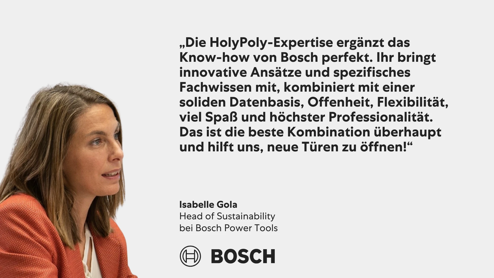 In this 2-minute interview, Isabelle Gola, Head of Sustainability at Bosch Power Tools, talks about the role of plastics in the Bosch Group's sustainability strategy and about the collaboration with HolyPoly.